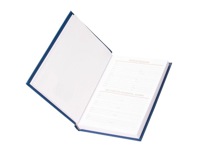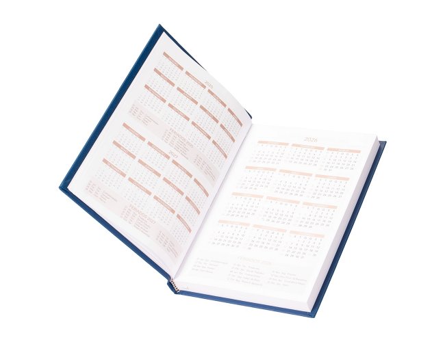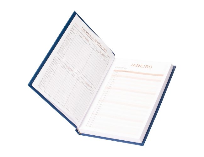Agenda 2026 com capa dura em cromato. Contém páginas dedicadas a dados pessoais, calendários de 2025 até 2027, orçamento pessoal, anotações, planejamentos mensais, lista de contatos e mapas.