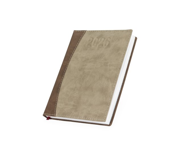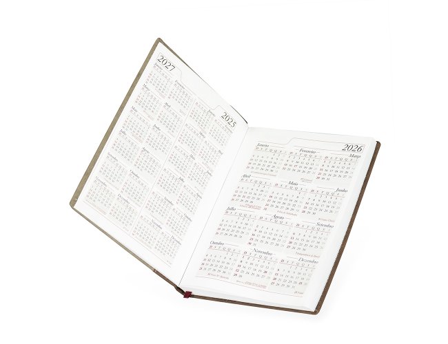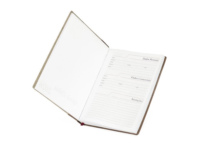 Agenda diária 2026 com capa de couro sintético e marca-página em fita de cetim. Contém páginas dedicadas a dados pessoais, calendários de 2025 a 2027, lista de contatos, planejamento diário e mapas.