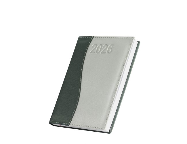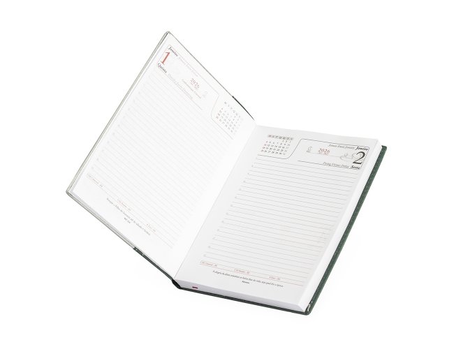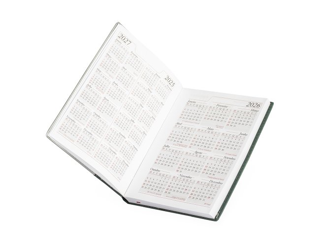 Agenda diária 2026 com capa em couro sintético e marca-páginas em fita de cetim. Contém páginas dedicadas a dados pessoais, calendários de 2025 a 2027, lista de contatos, planejamento diário e mapas. OBS.: PEDIDOS APENAS MÚLTIPLOS DE 10 PEÇAS!