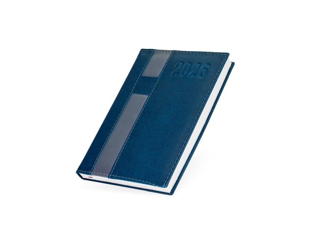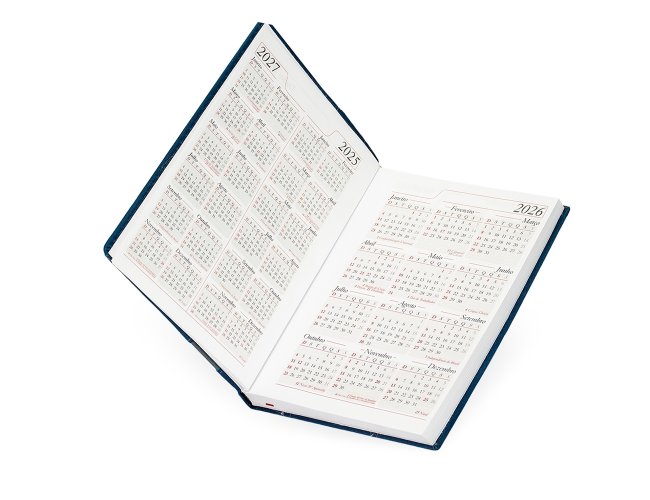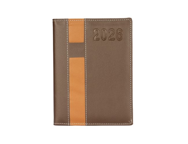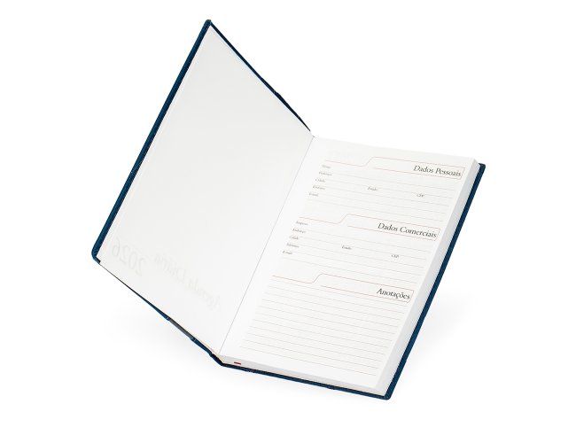 Agenda diária 2026 com capa em couro sintético, suporte para caneta e marca-páginas em fita de cetim. Possui páginas dedicadas a dados pessoais, calendários de 2025 a 2027, lista de contatos, planejamento diário e mapas. OBS.: PEDIDOS APENAS MÚLTIPLOS DE 10 PEÇAS!
