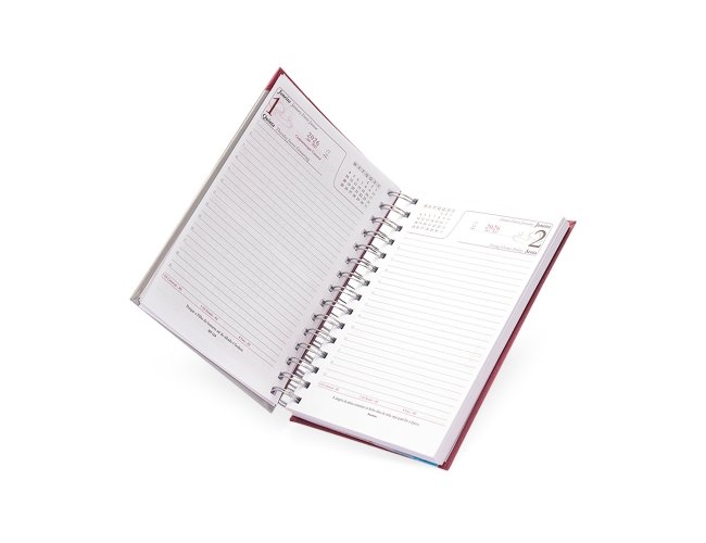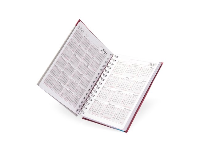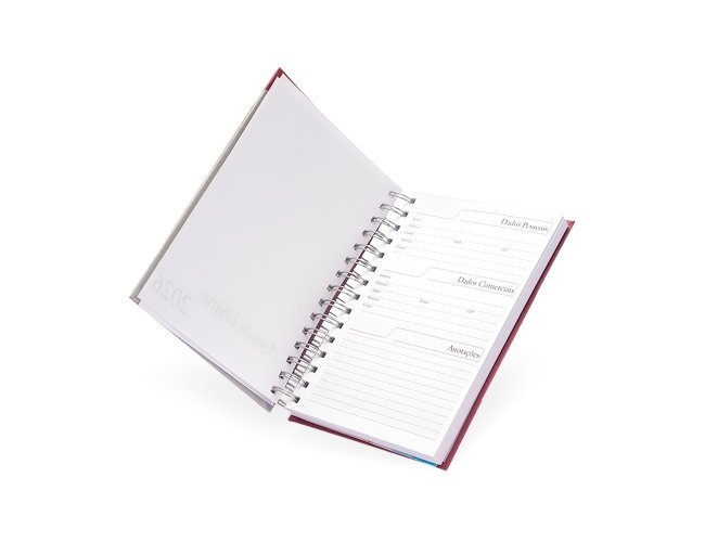 Agenda diária com capa dura em Percalux, encadernação Wire-O e bolso interno em plástico. Contém páginas dedicadas para dados pessoais, calendários de 2025 a 2027, lista de contatos, planejamento, mapas do Brasil e um mapa-múndi. OBS.: PEDIDOS APENAS MÚLTIPLOS DE 10 PEÇAS!
