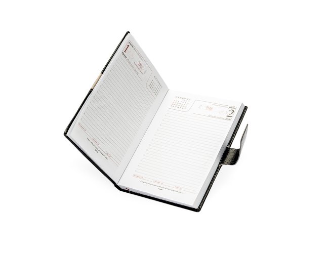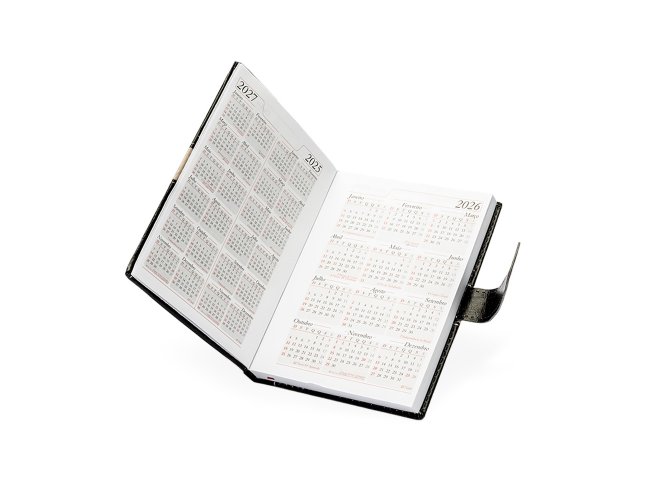 Agenda diária 2026 com capa em couro sintético, marca-páginas em fita de cetim e fecho com suporte para caneta. Contém páginas dedicadas para dados pessoais, calendários de 2025 a 2027, lista de contatos, planejamento e mapas.OBS.: IMAGEM MERAMENTE ILUSTRATIVA, NÃO ACOMPANHA CANETA! OBS.: IMAGEM MERAMENTE ILUSTRATIVA, NÃO ACOMPANHA CANETA! PEDIDOS APENAS MÚLTIPLOS DE 10 PEÇAS!
