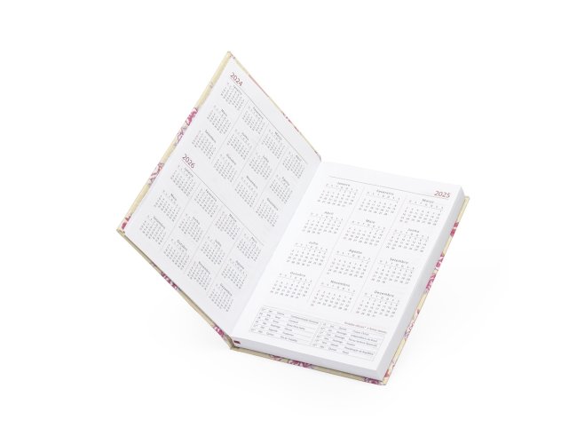 Inicie o ano com organização absoluta com a nossa agenda floral em couro sintético. Esta agenda clássica floral, oferece uma variedade de recursos úteis, incluindo dados pessoais, calendários de 2024 a 2026, mapas, números de telefone essenciais, fita de cetim para marcar páginas favoritas, espaço para planejamentos e aniversariantes, além de códigos de serviços DDD e DDI para facilitar comunicações globais.