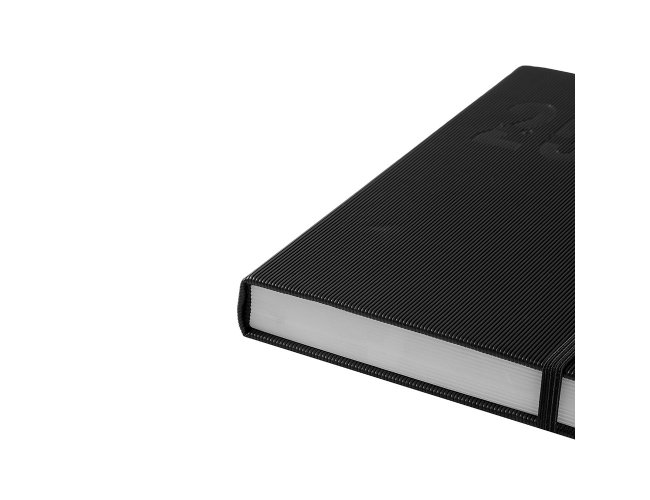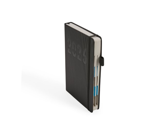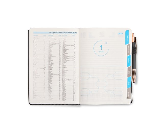 Agenda 2026 com capa dura em poliuretano (PU), marcador de páginas em cetim, porta-canetas e elástico para fechamento. Possui páginas dedicadas a dados pessoais, calendários de 2026 a 2028, lista de contatos e tabelas de pesos e medidas.