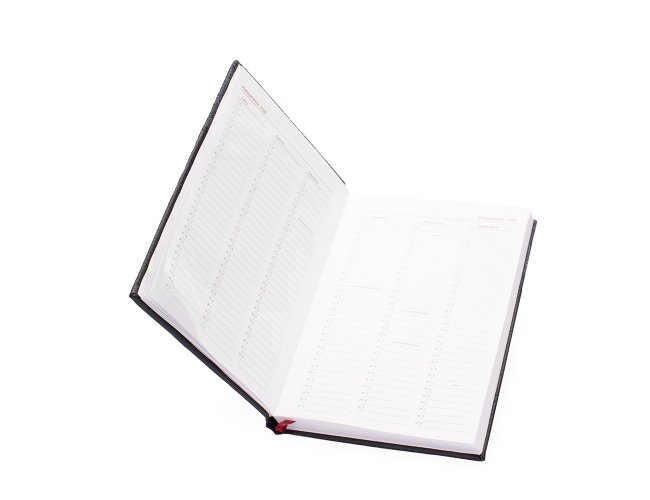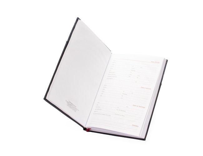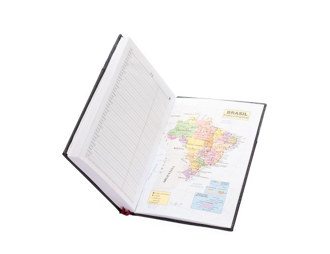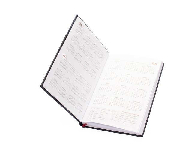 Agenda 2026 com capa dura em poliuretano (PU) e marcador de páginas em cetim. Possui páginas dedicadas a dados pessoais, calendários de 2026 a 2028, lista de contatos e itens de conversão de unidades de medidas, códigos DDD e DDI e mapas.