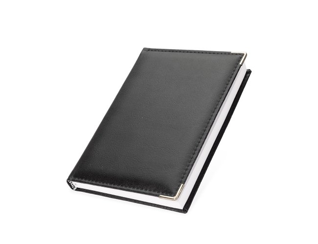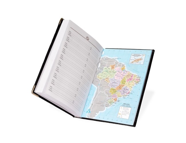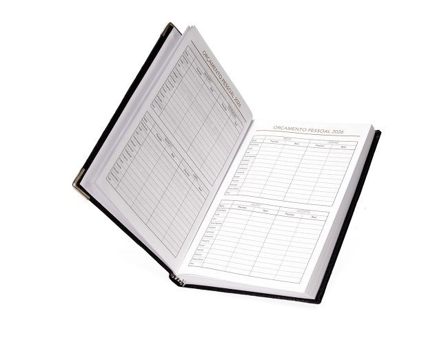 Agenda diária 2026 com capa em couro sintético e marca-página em fita de cetim. Possui páginas dedicadas para dados pessoais, calendários de 2025 até 2027, orçamento pessoal, planejamento mensal, lista de contatos e mapas.