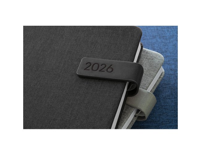 Agenda B5 em PET reciclado (100% rPET), com fecho magnético em PU. Possui um marcador em fita e suporte para esferográfica (não inclusa). Está organizada num plano semanal. Fornecida com bolsa de non-woven. 175 x 245 mm | Bolsa: 220 x 270 mm