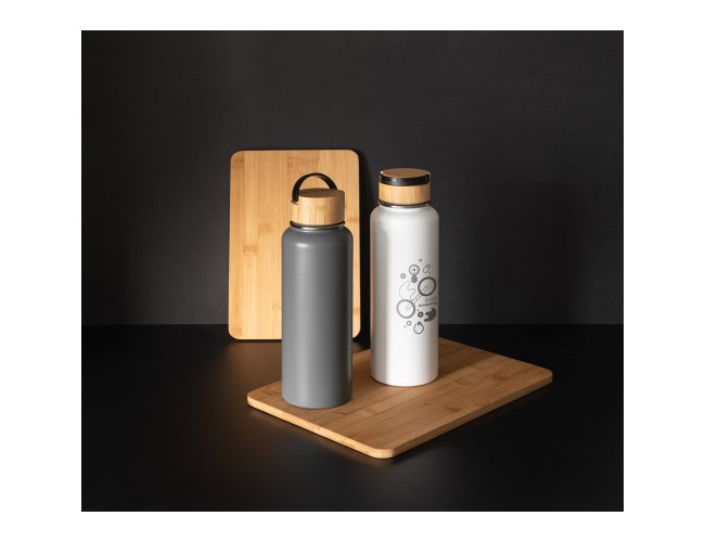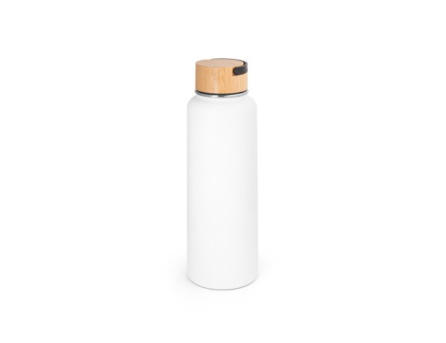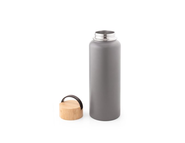 Garrafa em aço inox (90% reciclado) de parede dupla térmica, isolada a vácuo. Parede com revestimento em pó oferecendo mais durabilidade e resistência. Tampa em bambu com pega em plástico que facilita o transporte. Grande capacidade até 1.2 L. Fornecido em caixa presente de papel kraft. Certificação EU Food Grade. A cor e o resultado da impressão nos materiais naturais pode variar entre produtos. ø90 x 287 mm
