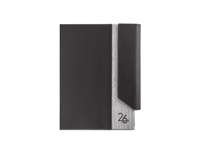 Agenda A5 em PU (58% reciclado) e PET reciclado (100% rPET) 300D com fecho magnético. Possui um suporte para esferográfica (não inclusa) e marcador em fita. Está organizada em plano diário (70 g/m²). Uma escolha com classe e requinte para o seu cotidiano. 148 x 210 mm