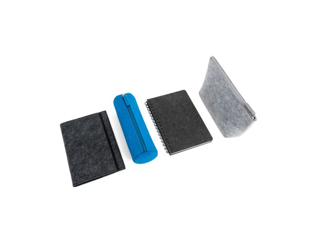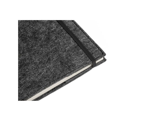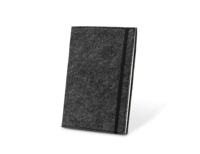 Capa em feltro 100% reciclado, com caderno A5 no interior. O caderno removível contém a capa em papel 100% reciclado, bem como 160 páginas pautadas (70 g/m²) também em papel 100% reciclado. 150 x 210 mm