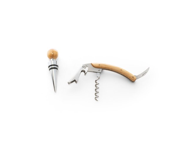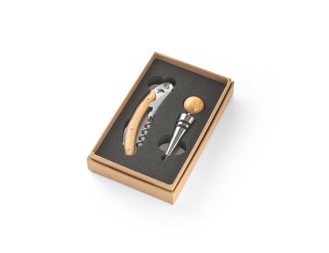 Conjunto de vinho com dois componentes em metal e bambu: um saca rolhas e um salva-gotas. Fornecido em caixa presente de papel kraft reciclado. A cor e o resultado da impressão nos materiais naturais pode variar entre produtos. Caixa: 159 x 99 x 29 mm