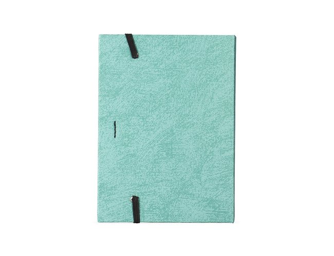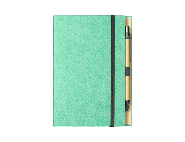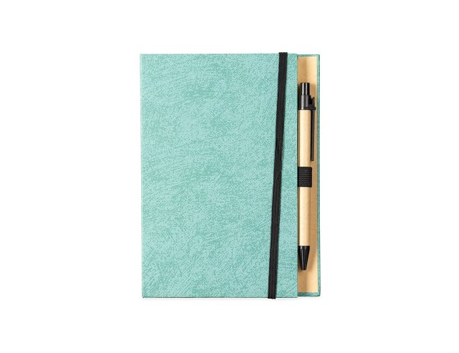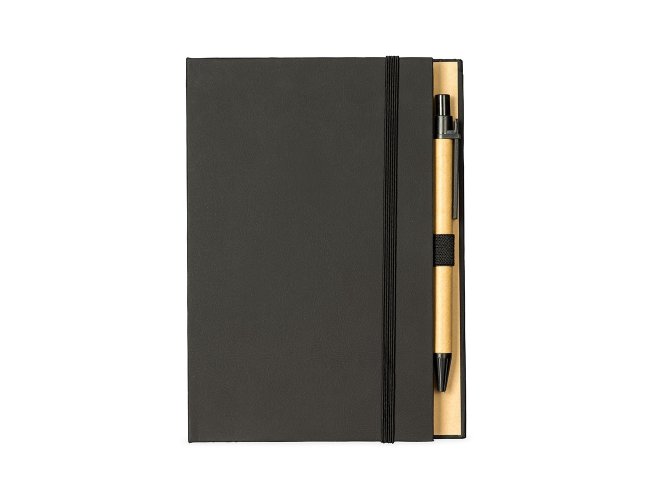 Um bloco de anotações com capa revestida em papel especial e fita elástica para fechamento. Contém aproximadamente 80 folhas amareladas destacáveis com pauta, além de um bloco com cerca de 20 folhas autoadesivas amarelas e aproximadamente 100 marcadores de página autoadesivos, divididos em cinco cores diferentes. Acompanha uma caneta esferográfica com carga azul de 1.0mm e acionamento por clique, corpo em papelão e demais componentes em plástico.