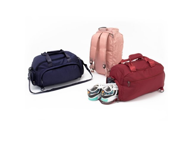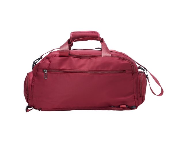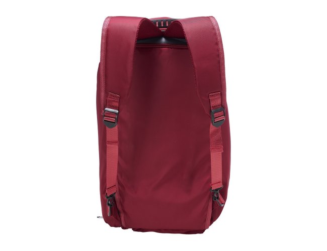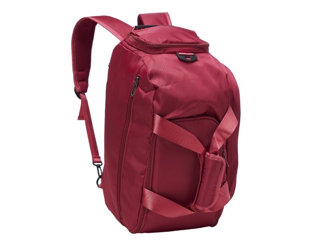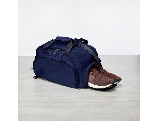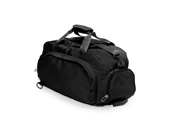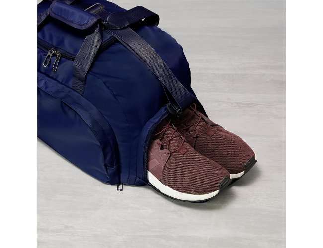 Bolsa esportiva de 32 litros em poliéster resistente à água com cinco compartimentos, sendo três deles exclusivos para tênis, itens molhados e armazenamento das alças de costas . Com alça transversal removível e alça de mãos com suporte de juntura, a bolsa contém alças para as costas ocultas no compartimento inferior, podendo ser transportada como mochila.