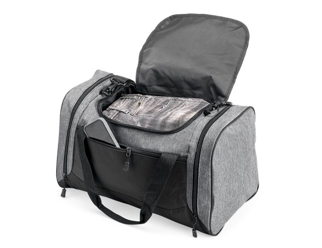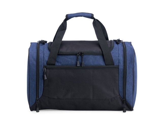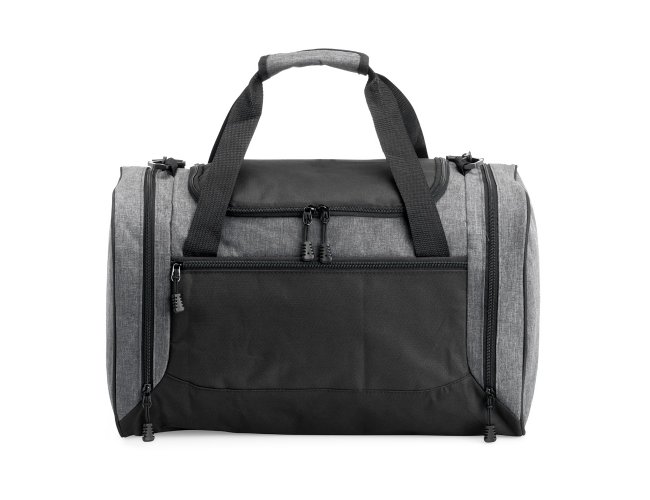 Bolsa de 46 litros confeccionada em nylon resistente à água, com quatro compartimentos, incluindo um bolso lateral com parte telada exclusivo para tênis. Possui alça transversal regulável e removível, além de duas alças de mão.