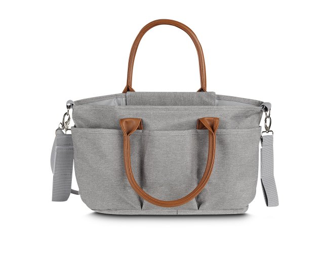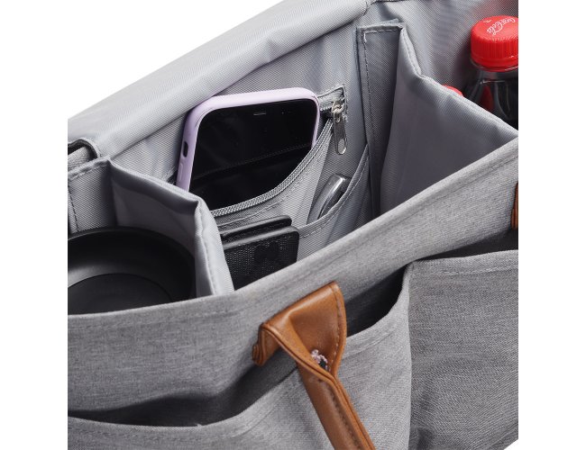 Bolsa Multifuncional em poliéster com detalhes em PU, possui 5 compartimentos externos. Conta com alças de ombro e mão em PU, engate para carrinho de bebê e velcro para fechamento interno. O interior oferece 5 divisórias removíveis, sendo uma com zíper e uma com tecido térmico, proporcionando praticidade e organização.