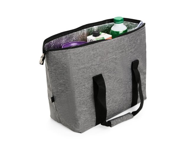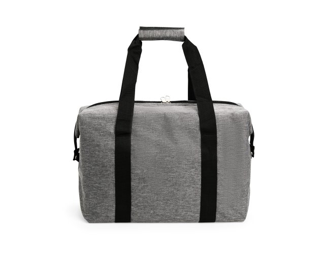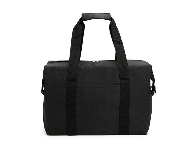 Bolsa térmica confeccionada em Oxford resistente à água, fechamento em zíper e capacidade de até 25 litros. Possui revestimento térmico interno em folha de alumínio, botões laterais de metal para junção, bolso externo e alças de mão em nylon com suporte de união por velcro.