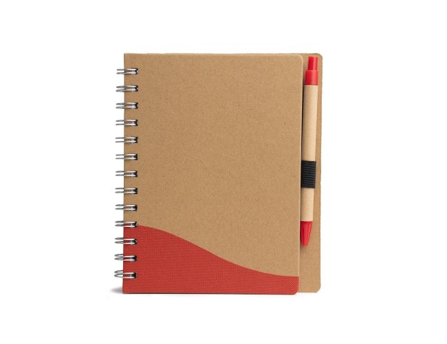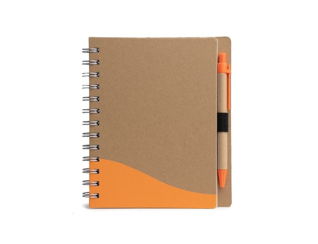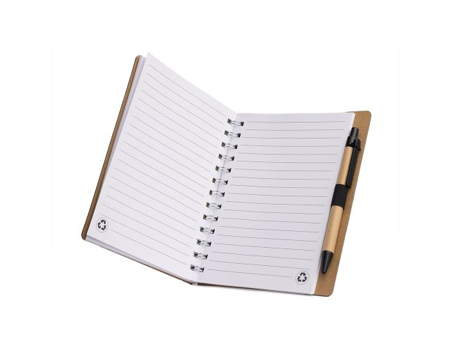 Caderneta ecológica com caneta, capa produzida em papelão com detalhe texturizado e verso liso. Contém miolo com aproximadamente 70 folhas pautadas, suporte de nylon e acompanha caneta de papelão com clip e ponteira de plástico, carga esferográfica 1.0mm e acionamento por clique