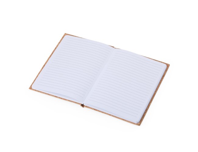 Caderneta de bambu com detalhe em cortiça. Possui aproximadamente 96 folhas brancas pautadas e suporte para caneta.