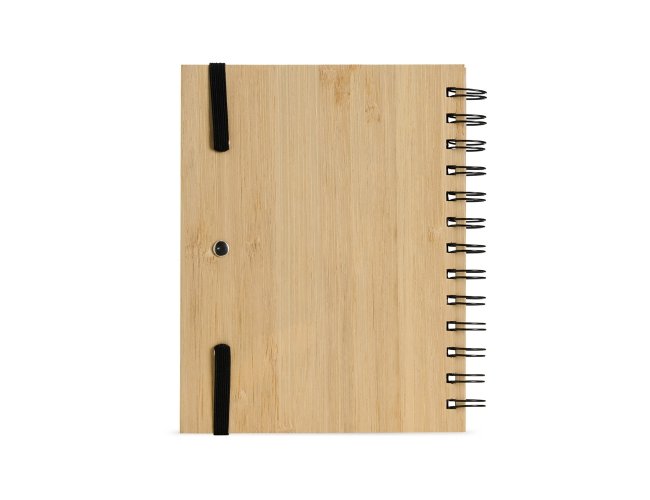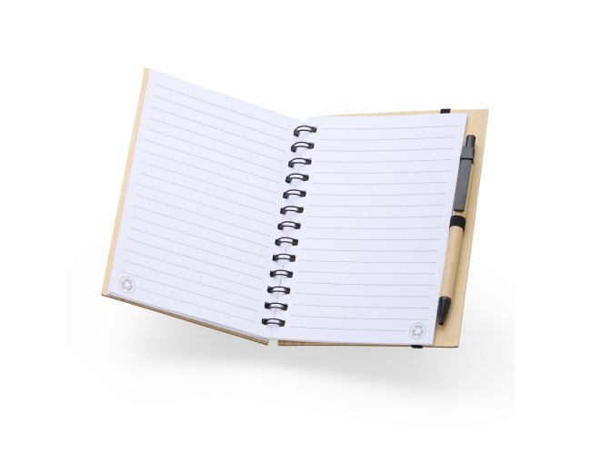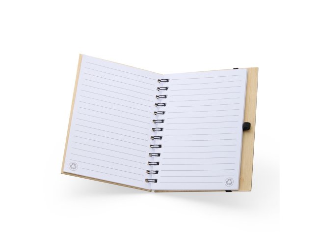 Caderneta ecológica com caneta. Capa de bambu. Possui aproximadamente 70 folhas brancas pautadas com logo reciclado na lateral inferior. Acompanha suporte elástico de nylon com uma caneta de papelão de detalhes plásticos.