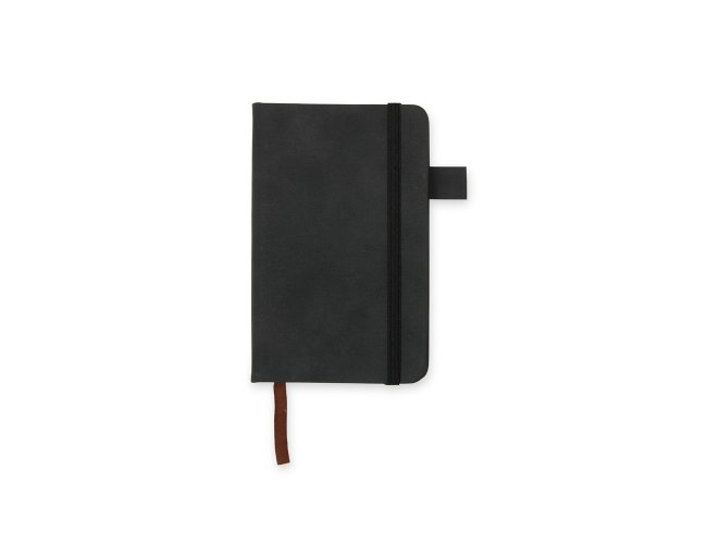 Caderneta em PU com marcador de página em cetim e fita elástica para fechar. Contém aproximadamente 80 folhas amareladas sem pauta.