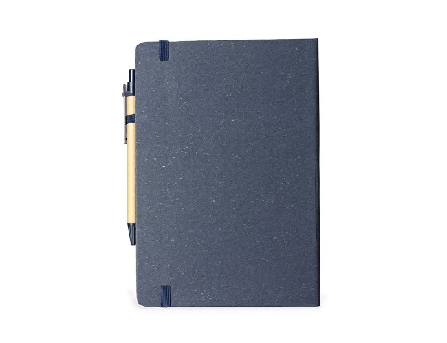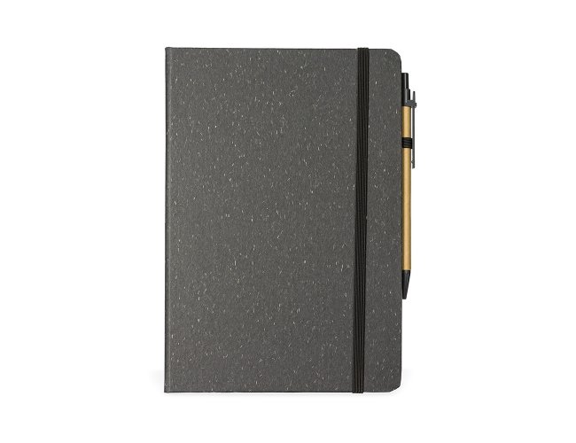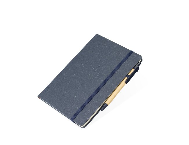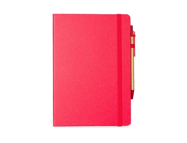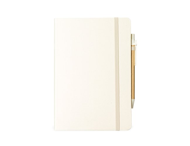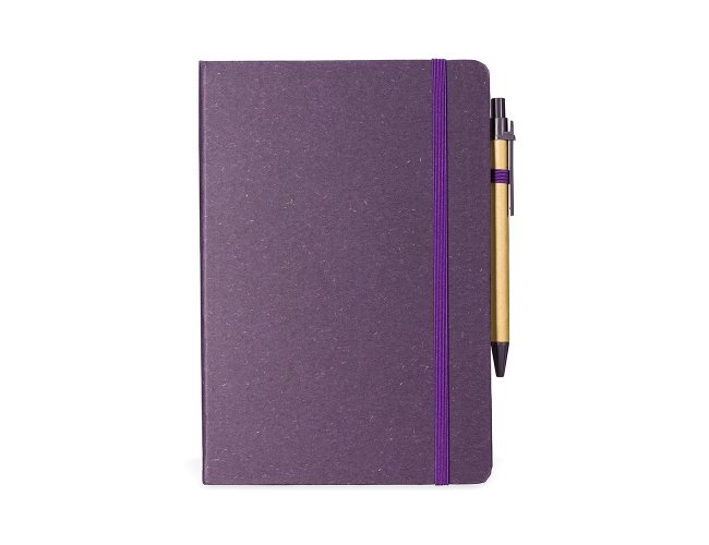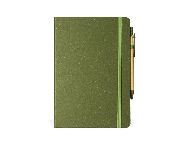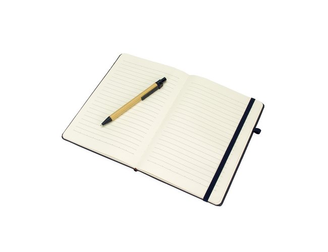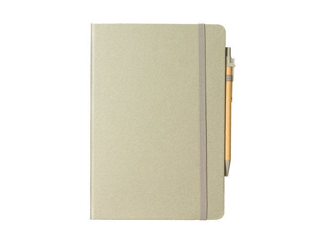 Caderneta ecológica com capa em fibra da palha de arroz. Contém aproximadamente 80 folhas amareladas com pauta, além de duas folhas de guarda, uma fita elástica para fechamento e porta-canetas em elástico. Acompanha uma caneta esferográfica de carga azul de 1,0mm com corpo em papelão e clip, acionamento por clique e ponteira em plástico.