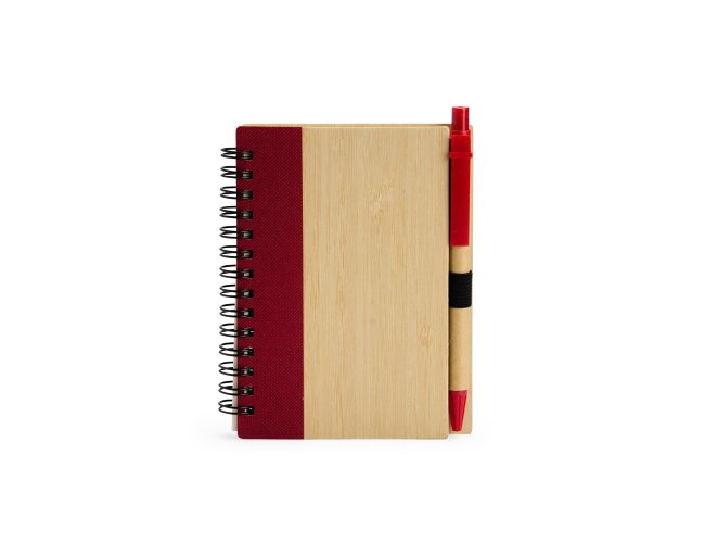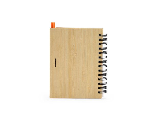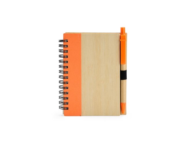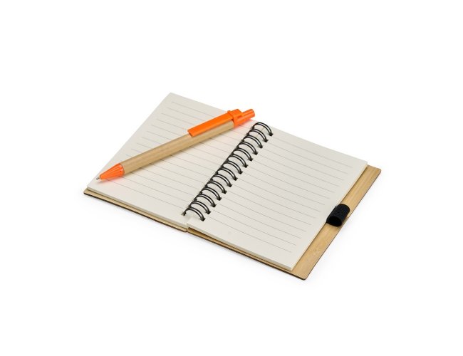 Um caderno feito para quem deseja anotar ideias e projetos sem abandonar a preocupação com o meio ambiente. Com capa feita em casca de bambu e faixa vertical colorida, ele conta também com encadernação Wire-O e aproximadamente 70 folhas amareladas pautadas. Além disso, o caderno acompanha uma caneta esferográfica de carga azul de 0,8 mm com corpo em papelão e clip, acionamento em clique e ponteira em plástico. A capa contém um elástico para abrigar a caneta junto ao caderno.