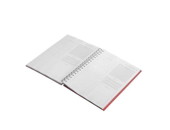 Caderno planner com capa rígida em PU de 2mm em formato espiral. Contém 90 folhas brancas de 95g/m². Folhas estruturadas em formato de planner para anotações e gestão da rotina.