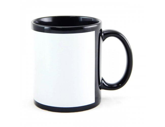 Caneca cerâmica 300ml preta com tarja branca para aplicação da arte/logo através de sublimação