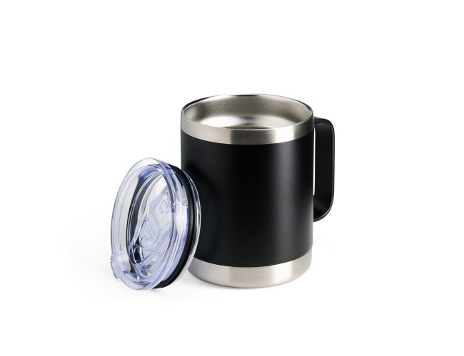 Caneca térmica de inox 350ml com parede dupla. Contém tampa acrílica com bocal e trava de segurança.