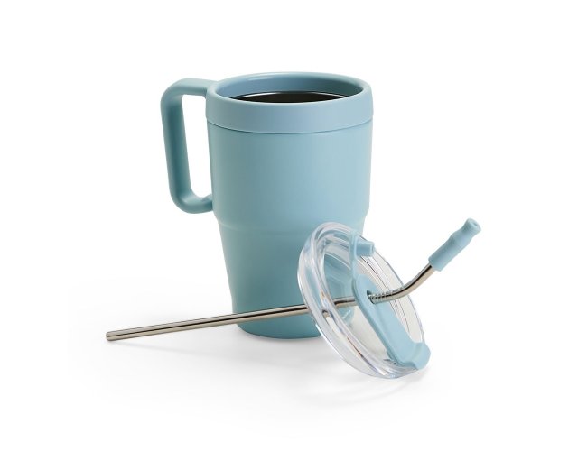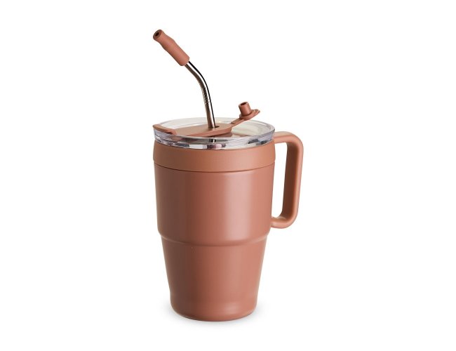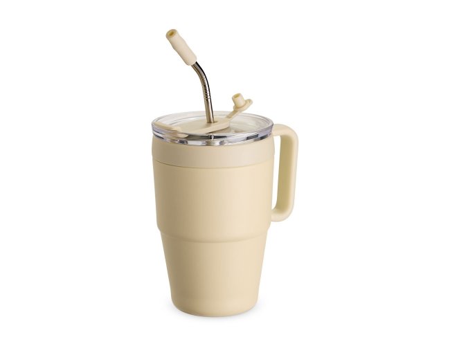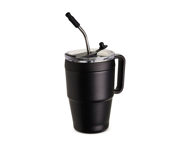 Caneca térmica em inox com pintura eletrostática e capacidade de até 600ml. Apresenta estrutura de parede dupla, base antiderrapante e tampa plástica com vedação a vácuo, protetor emborrachado para o bocal com acesso para canudo. Acompanha canudo de inox com ponta removível em plástico.