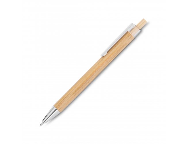 Caneta com corpo em bambu, acionador em bambu com detalhe plástico, ponteira e clipe cromado.