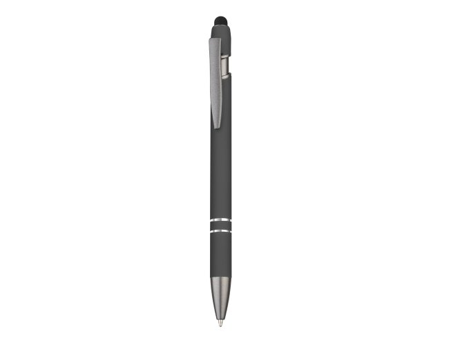 Caneta esferográfica em metal escrita em azul com cor fosca. Refil tipo parker com ponta touch emborrachada e detalhe cromado.
