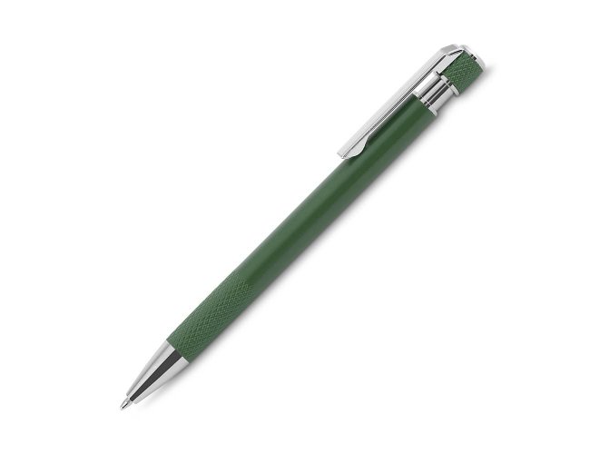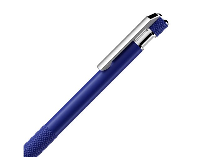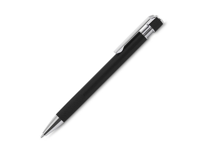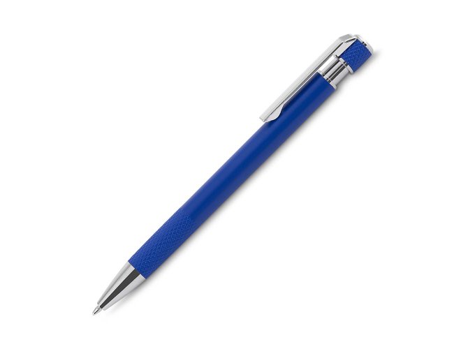 Caneta esferográfica com corpo em alumínio reciclado, acionador e clipe cromado, escrita em tinta azul. Refil substituível tipo Parker.