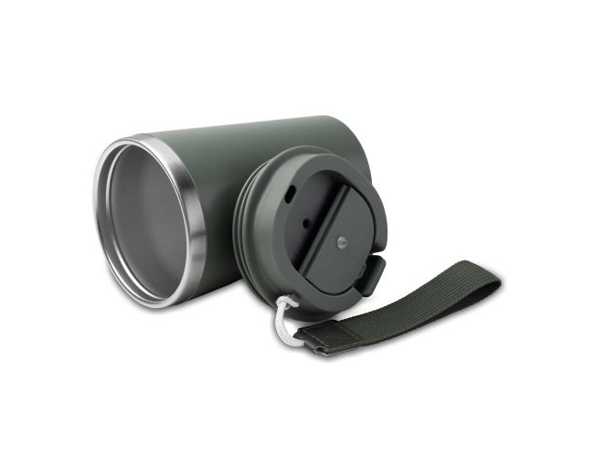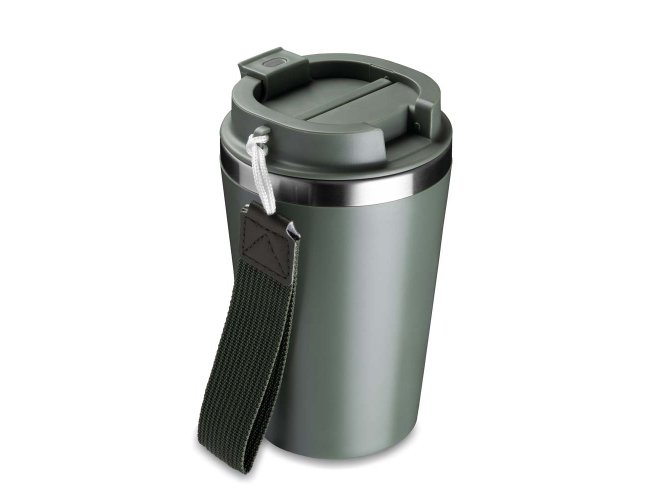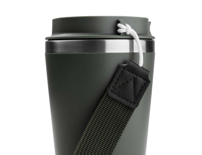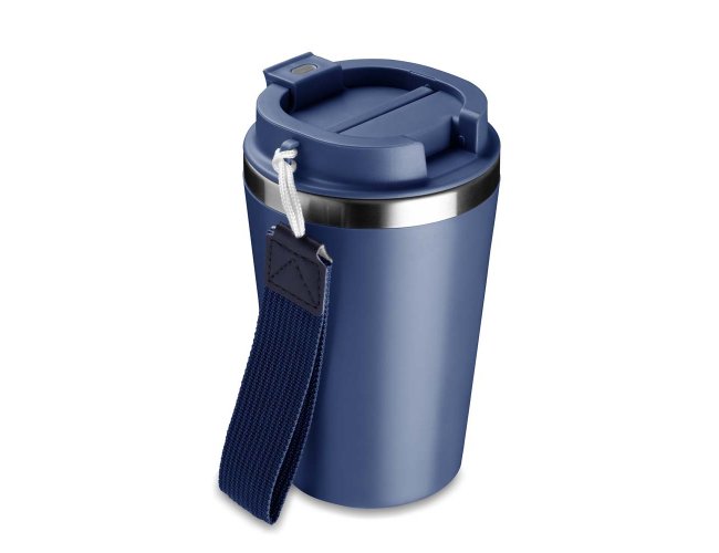 Copo de 350 ml com parede dupla, interior em inox 304 e exterior em plástico PP, tampa em plástico PP, alça de mão e acabamento com pintura fosca.