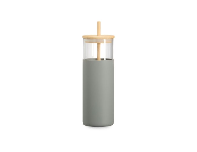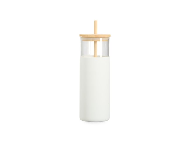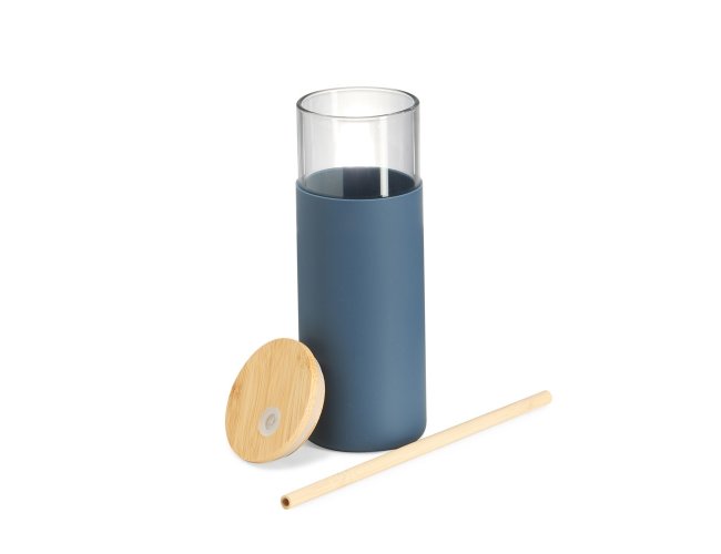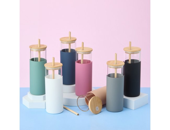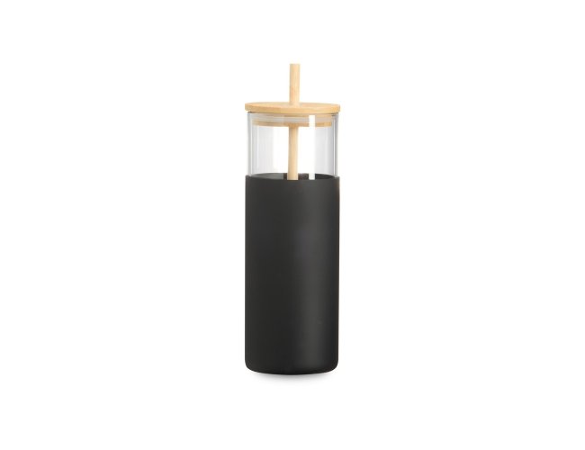 Copo de vidro borossilicato com capacidade de 500ml. Inclui canudo e tampa de bambu com abertura para canudo, além de uma luva de silicone para melhor aderência.