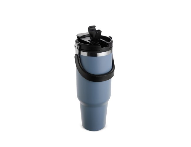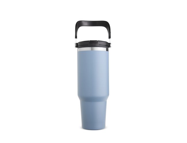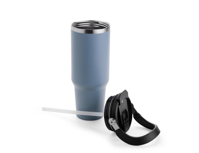 Copo térmico em inox com capacidade de até 1,25 litro. Possui estrutura de parede dupla e tampa plástica rosqueável com vedação a vácuo, o que permite conservar a temperatura de líquidos por mais tempo. Conta ainda com alça para transporte em inox com revestimento em plástico e canudo plástico removível.