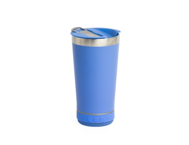 Copo térmico de inox com caixa de som e capacidade 400ml. Contém tampa com abridor. Caixa de som bluetooth com botão para ligar/desligar, botões para aumentar diminuir volume/ avançar e retroceder faixas. Acompanha cabo USB Tipo-C. Obs.: A caixa de som não é a prova dágua, para a higienização do copo é necessário desrosquear a caixa de som para remove-la.