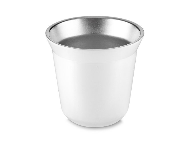Copo em inox com capacidade máxima de 80ml. Possui estrutura de parede dupla que permite manter a temperatura de líquidos por mais tempo.
