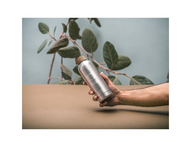 Squeeze em aço inox de parede simples, com tampa em cortiça. Capacidade até 760 mL. Fornecido em caixa presente de papel kraft reciclado. Certificação EU Food Grade. A cor e o resultado da impressão nos materiais naturais pode variar entre produtos. ø70 x 227 mm