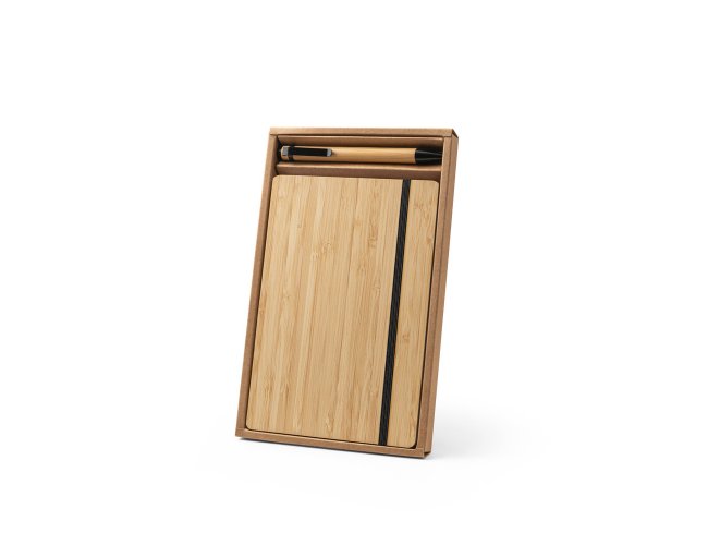 Conjunto de caderno A5 e esferográfica em bambu. O caderno de capa e contracapa em placa de bambu e lombada em poliéster 100% reciclado, contém 192 páginas pautadas em papel 100% reciclado, suporte para esferográfica (inclusa) e elástico para fecho do caderno. Esferográfica em bambu e escrita em preto. Fornecido em caixa presente de oferta de papel kraft reciclado. A cor e o resultado da impressão nos materiais naturais pode variar entre produtos. Caderno: 140 x 210 mm | Esferográfica: ø11 x 138 mm | Caixa de oferta: 160 x 255 x 18 mm