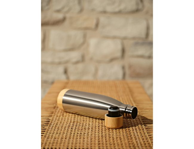 Garrafa em aço inox (90% reciclado) de parede dupla térmica, isolada a vácuo. Com tampa e base em bambu. Capacidade até 550 mL. Fornecido em caixa presente kraft. Certificação EU Food Grade