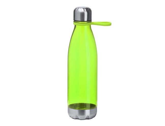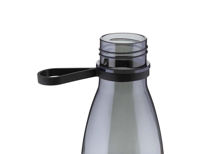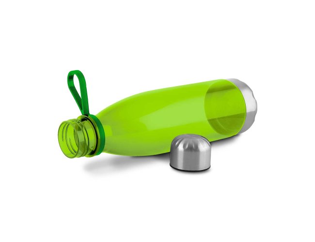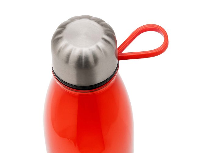 Garrafa plástica em RPET com capacidade de até 700 ml com alça flexível em silicone. Tampa rosqueável com anel de silicone para vedação, base em metal.