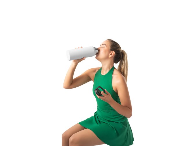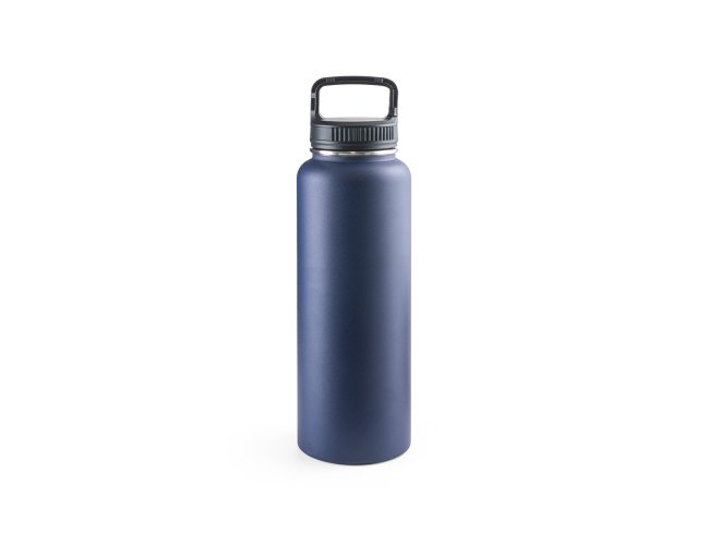 Garrafa esportiva em aço inox (90% reciclado) de parede dupla térmica, isolada a vácuo. Parede com revestimento em pó oferecendo mais durabilidade e resistência. Tampa com pega e um mosquetão que facilitam o transporte. Grande capacidade até 1.2 L. Fornecido em caixa presente de papel kraft. Certificação EU Food Grade. ø90 x 310 mm