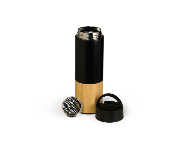 Garrafa térmica produzida em inox 304 com capacidade de 420ml, acompanha peneira para infusão de bebidas. Com detalhes em bambu e plástico, sua tampa é livre de BPA e possui uma alça para transporte que também pode ser utilizada como suporte para celular.