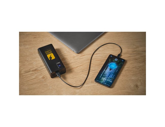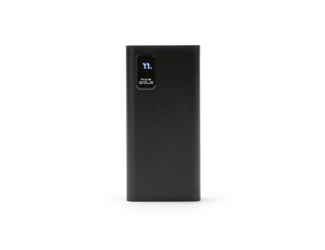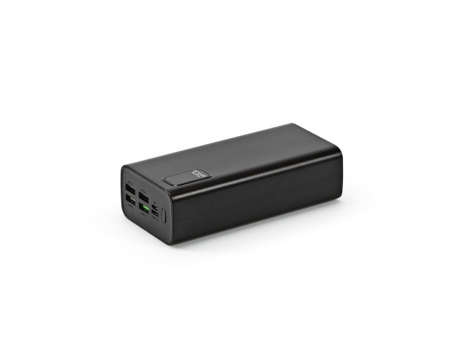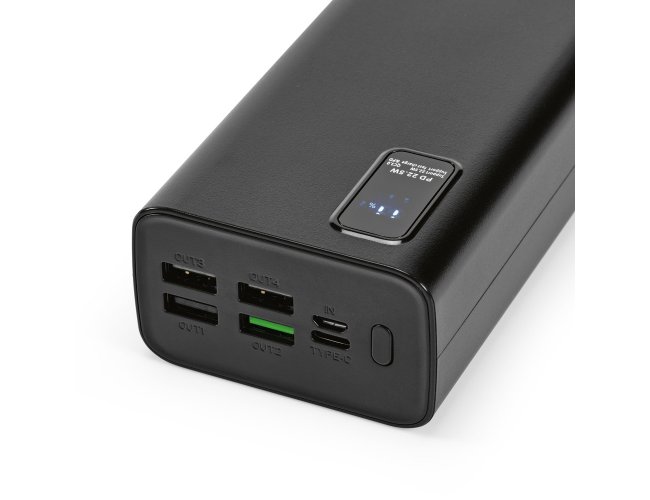 Bateria portátil em ABS 100% reciclado. Bateria em lítio com capacidade de 30.000 mAh e tempo de vida ≥ 300 ciclos. Possui entrada micro-USB e USB-C, 4 saídas USB-A e uma saída USB-C. A parte frontal tem uma tela de LED com informações do nível de carga da bateria. Incluso cabo USB-C para carregamento da bateria. Fornecida em caixa presente de papel kraft. 143 x 69 x 41 mm | Caixa: 75 x 150 x 45 mm