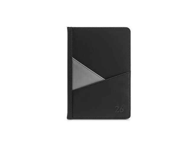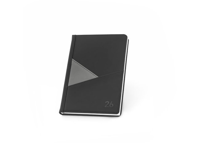 Agenda A5 em PU (58% reciclado), com fecho magnético e placa metálica. Possui um suporte para esferográfica (não inclusa) e um marcador em fita. Está organizada em plano diário (70 g/m²). 148 x 212 mm