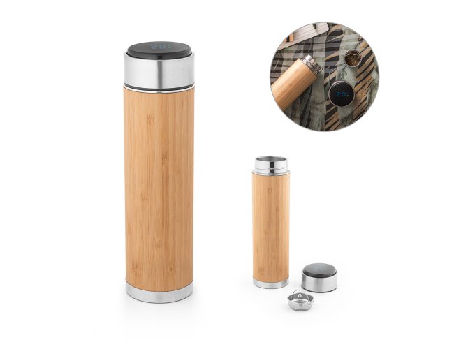 Garrafa em aço inox e bambu de parede dupla térmica, isolada a vácuo. Capacidade até 430 mL. A tampa contém um termômetro digital que permite saber, a qualquer momento, a temperatura da bebida. Inclusa pilha e infusor para chá. Certificação EU Food Grade. A cor e o resultado da impressão nos materiais naturais pode variar entre produtos. ø65 x 235 mm