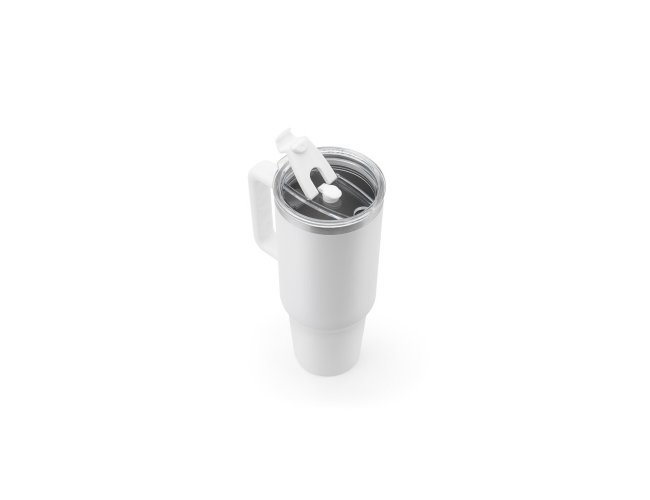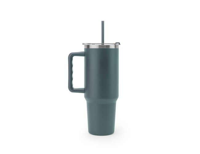 Copo de viagem de grande dimensão para se manter hidratado durante o dia sem a necessidade de recargas constantes. Composto por aço inox 91% reciclado, com parede dupla isolada a vácuo e acabamento em mate. Este copo pode ser utilizado de duas maneiras: através da sua abertura para canudo ou do orifício para utilização direta (pode ser fechado). A sua pega facilita o transporte quer seja para o trabalho ou para atividades ao ar livre. Capacidade até 1300 mL. Fornecido em caixa presente de papel kraft reciclado. Certificação EU Food Grade. ø143 x 257 mm (sem canudo)