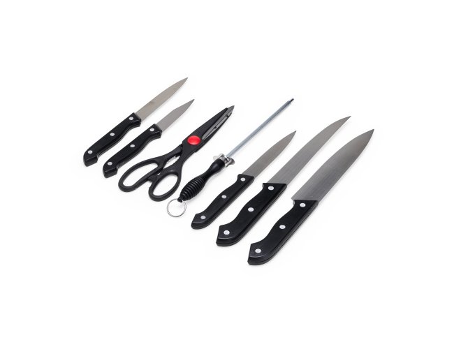 O churrasco vai ficar ainda melhor com o nosso kit de 7 peças em inox, incluso: uma faca de chef de 7 polegadas; uma faca de desossa de 7 polegadas; uma faca para fatiar de 4,5 polegadas, uma faca de descascar de 4,5 polegadas, uma faca de legumes de 3 polegadas; uma chaira, essencial para manter as facas sempre afiadas; e uma tesoura multiuso para cortar alimentos, legumes, verduras e carnes, todas as peças possuem cabo plástico. Além disso, a tesoura possui pequenos dentes entre os cabos que funcionam como um quebra-nozes. O kit também acompanha uma plaquinha de metal, permitindo a personalização para dar um toque único ao estojo e ainda mais estilo quando for preparar aquele churrasco de respeito.