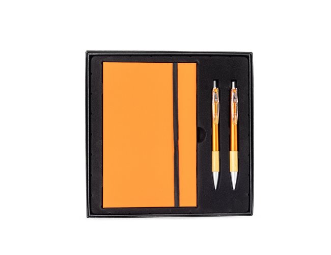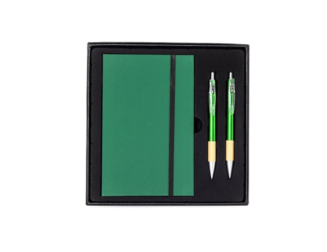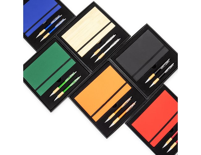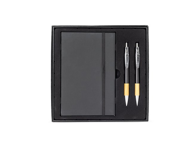 Kit executivo com três peças, composto por uma caderneta, uma caneta e uma lapiseira. A caderneta possui capa dura em papelão reforçado, fechamento em elástico, cerca de 82 folhas pautadas, bloco de folhas amarelas e outro com marcadores autoadesivos coloridos. A caneta e a lapiseira contam com corpo em plástico e detalhes em bambu. Além disso, a caneta possui carga esferográfica azul de 1,0 mm, enquanto a lapiseira dispõe de grafite de 0,7 mm. Acompanha caixa em papelão com berço em plástico para guardar os itens do conjunto.